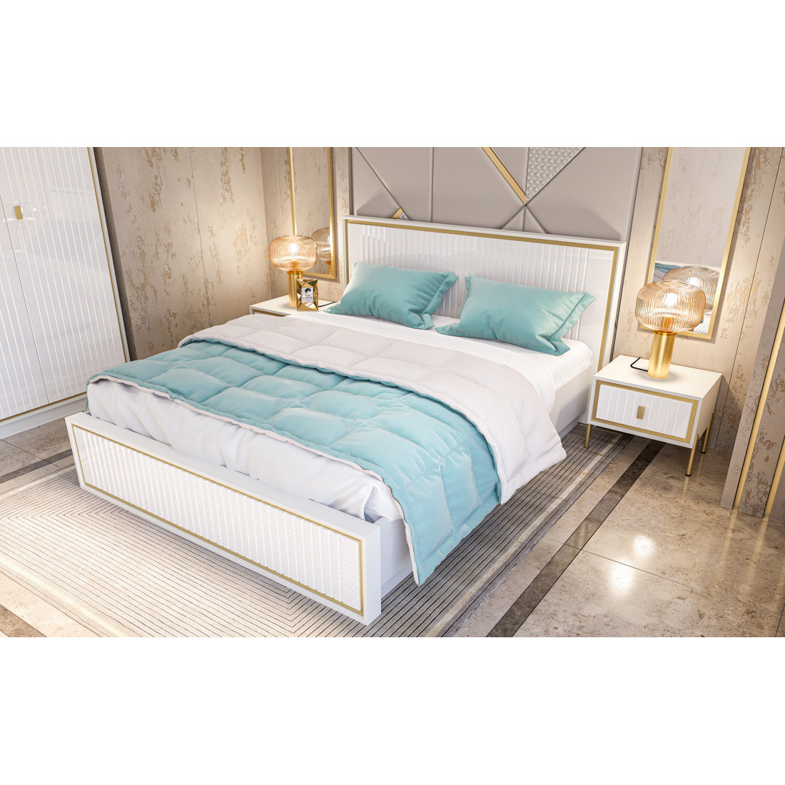 Белоснежная кровать из МДФ в цвете белый глянец. Изголовье кровати  украшено золотистой  каймой и рефленной фрезеровкой.