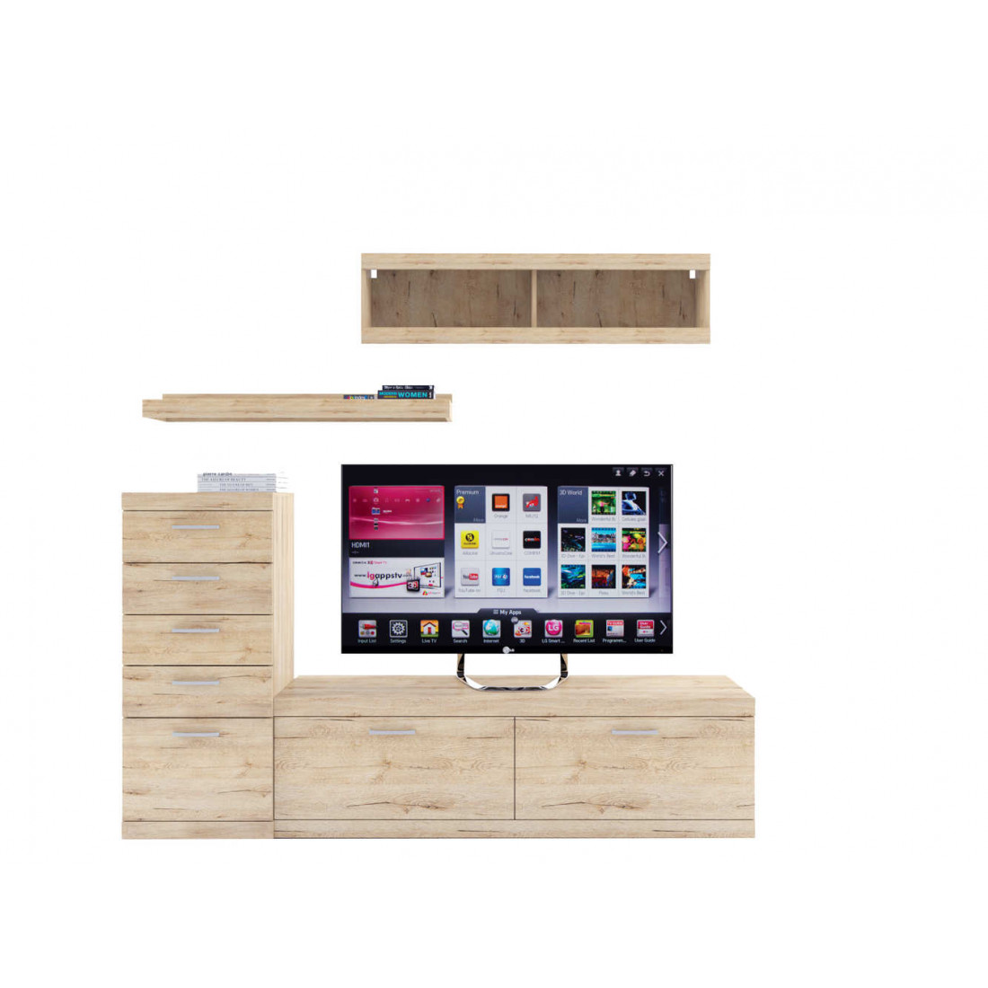 2. 4 варианта тумб RTV с выдвижными ящиками на шариковых направляющих. 2 размера надставных полок для RTV-тумб (полка TVB и полка TV), позволяющих установить выше телевизор. Варианты навесных полок, соответствующих по размеру тумбам для телевизора. Тумба RTV 2S2NL имеет глубину 351 мм, что позволяет составить модули, имеющие такую же глубину, в одну линию без выступающих элементов.