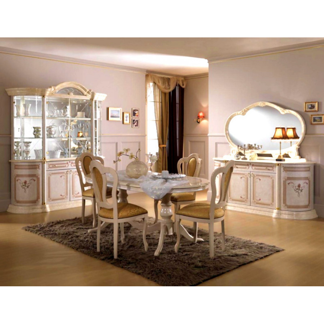 Гостиная Роза (беж) от фабрики ДИА мебель. Вся композиция выполнена в классическом стиле. Бежевый цвет в сочетании с глянцевым покрытием придает этой модели изящность и элегантность. Золотистый орнамент и аккуратные золотистые ручки на фасаде придадут чувства стиля. Мягкие и комфортные стулья помогут вам насладиться прекрасным вечером, после рабочего дня.