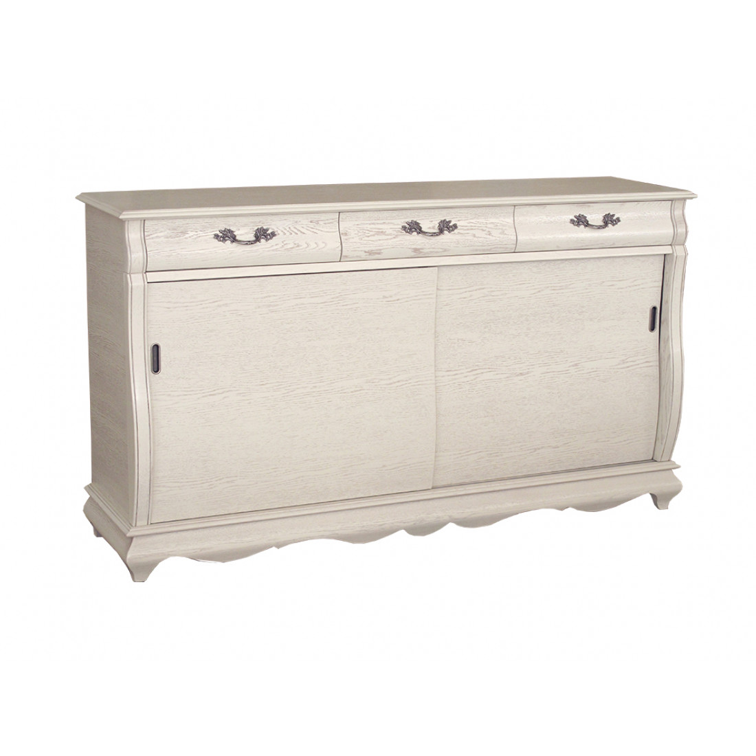 Комод для гостиной из коллекции мебели "Оскар" это классическая и многофункциональная модель. Оснащен двумя раздвижными дверцами и тремя выдвижными ящиками с ажурной фурнитурой. Слегка изогнутые бока фасада и резной рельеф каркаса придают силуэту модели изящность и оригинальность. Комод выполнен с использованием массива и шпона дуба и окрашен в оттенок "Белая эмаль с патиной".