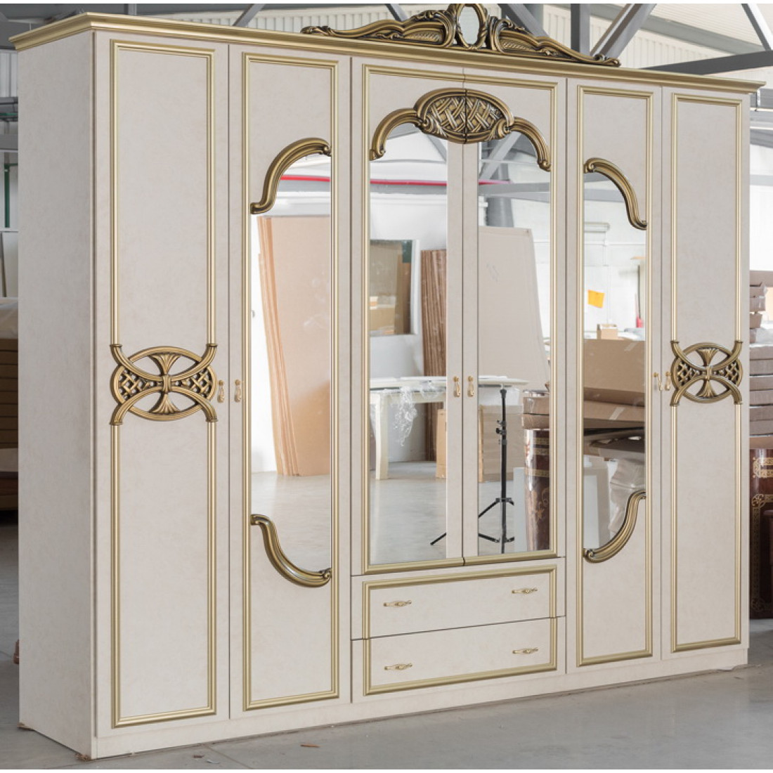 Шестистворчатый шкаф Ольга (беж) от Российской фабрики "ДИА мебель" выполнен элегантно в нежном бежевом цвете с глянцевым покрытием. Помимо шести открывающихся дверей, шкаф имеет два выдвижных ящика, на роликах, обеспечивающих бесшумное и плавное выдвижение. Фасад шкафа украшен объемными, резными вставками, в которые заключено большое зеркало. С его помощью с легкостью можно будет сделать комнату легче и просторнее. Коллекция "Ольга" подойдет для настоящих ценителей классического стиля.