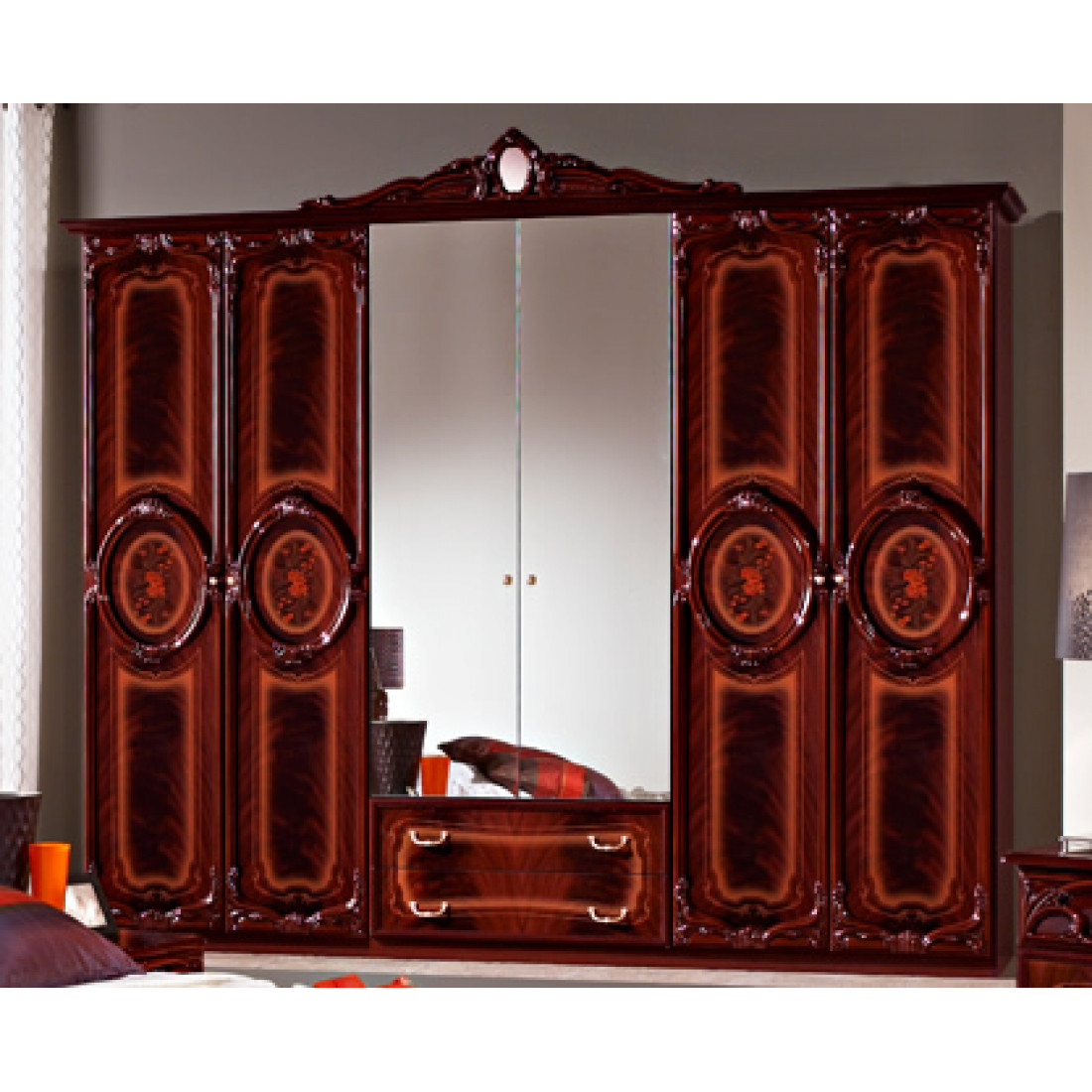 Шестистворчатый шкаф для одежды Роза (могано) от Российской фабрики "ДИА мебель". Модель шкафа выполнена в элегантном классическом стиле. Цвет могано с глянцевым покрытием придает больше эстетичности. Шкаф поделен на три части, каждая из которых имеет не только вместительные полки для одежды но и большую штангу для вешалок. Такой большой шести створчатый шкаф поможет Вам сэкономить место и удивит своей вместимостью.