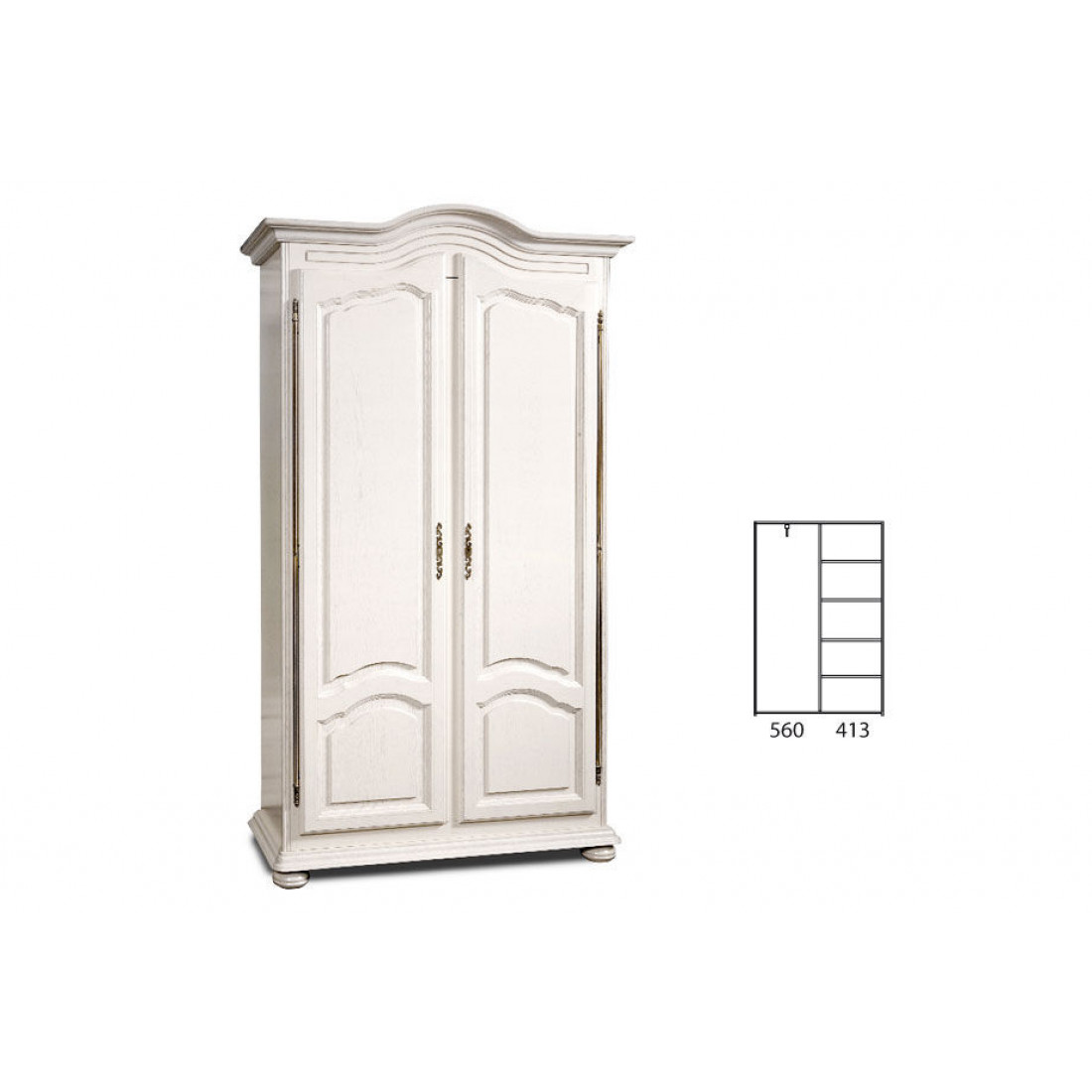 Двухдверный шкаф для одежды из набора мебели для жилой комнаты "Давиль". Внутри находятся четыре полки для одежды и выдвижная штанга. Фасад выполнен из массива дуба и декорирован изогнутым арочным карнизом. Выполнен в цвете "Белая эмаль".