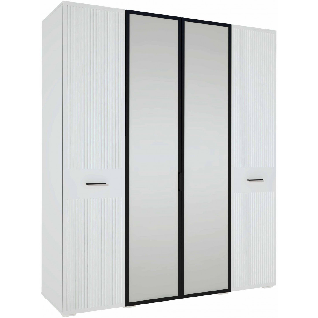 -Фасад выполнен из МДФ с декоративной фрезеровкой в виде вертикальных полос и окутаны плёнкой ПВХ цвета «Белый матовый»;