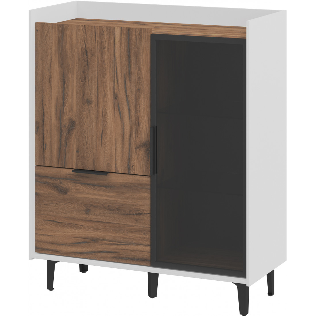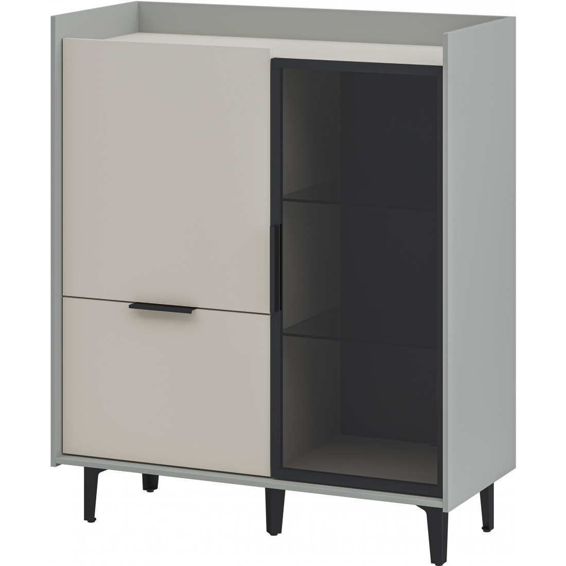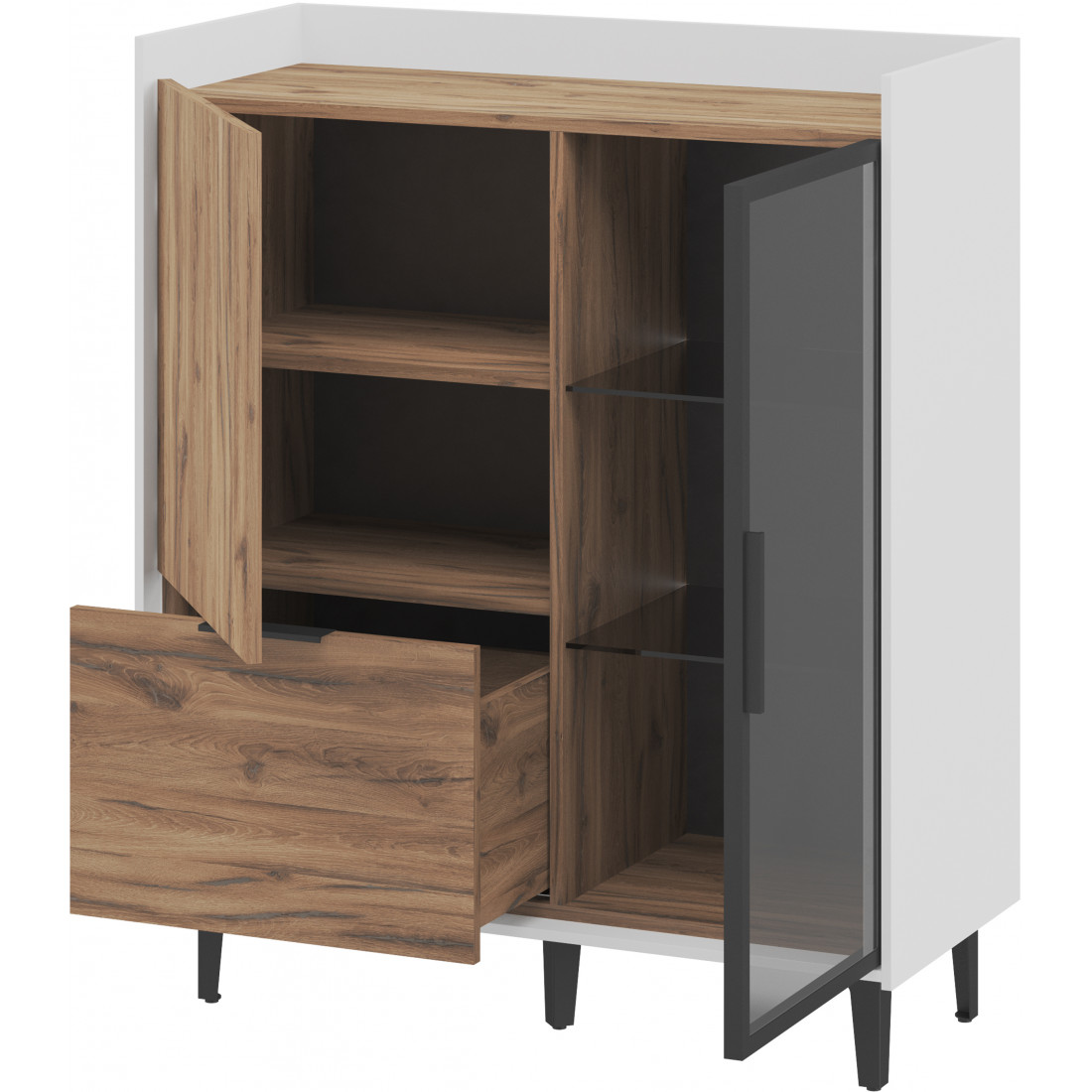 Шкаф Модена — это стильное решение для вашей гостиной с двумя уникальными отделениями. Подчеркните ваш дизайн, выбрав цвет из трех вариантов: Белый-Дуб Элисон, Лунный камень-жемчуг, Металл Бруклин-лунный жемчуг. Ножки из металла обеспечивают устойчивость. Первое отделение предлагает большой ящик и полки для удобного хранения разнообразных предметов, а второе — элегантные стеклянные полки и фасад из темного стекла, придающие шкафу изысканный вид. Шкаф Модена — идеальное сочетание функциональности и эстетики для вашей гостиной