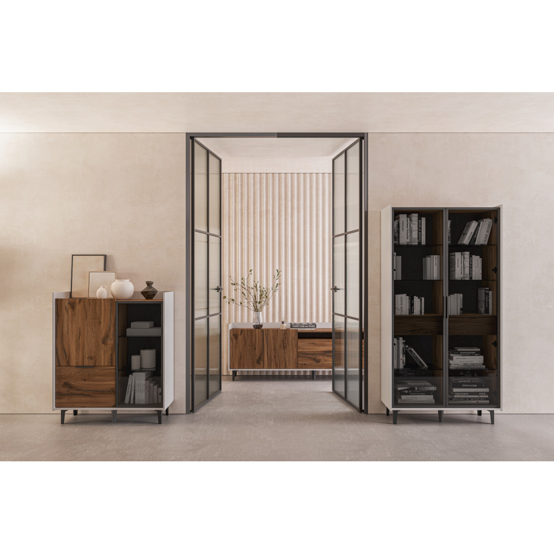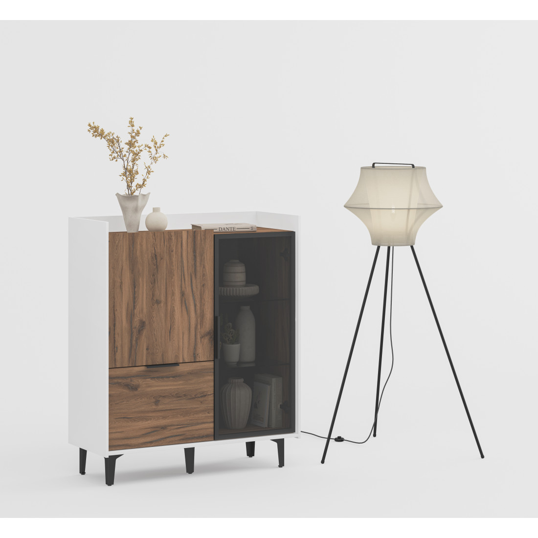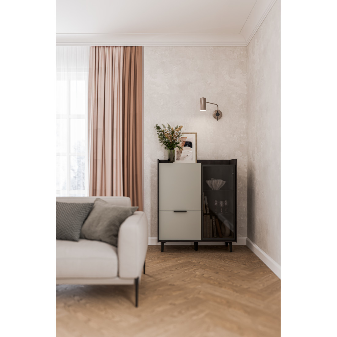 Шкаф Модена — это стильное решение для вашей гостиной с двумя уникальными отделениями. Подчеркните ваш дизайн, выбрав цвет из трех вариантов: Белый-Дуб Элисон, Лунный камень-жемчуг, Металл Бруклин-лунный жемчуг. Ножки из металла обеспечивают устойчивость. Первое отделение предлагает большой ящик и полки для удобного хранения разнообразных предметов, а второе — элегантные стеклянные полки и фасад из темного стекла, придающие шкафу изысканный вид. Шкаф Модена — идеальное сочетание функциональности и эстетики для вашей гостиной