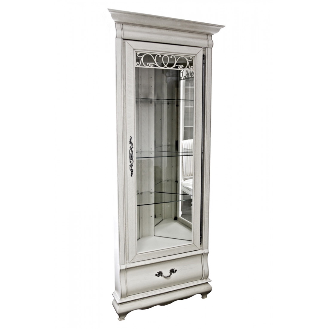 Угловой шкаф с витринным стеклом из коллекции мебели для гостиной "Оскар" отличается высокими карнизами и плавными изгибами форм. Стекло витрины с фацетом и оригинальным растительным узором, выдвижной ящик на направляющих. Модель выполнена с использованием массива дуба и окрашена в оттенок "Белая эмаль с патиной". Дверца открывается вправо.