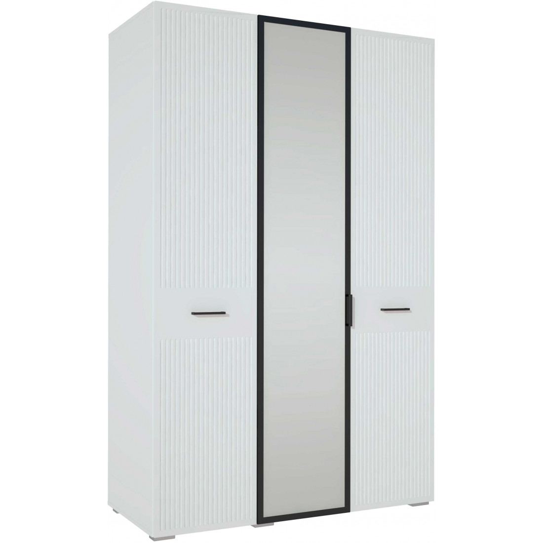 -Фасад выполнен из МДФ с декоративной фрезеровкой в виде вертикальных полос и окутаны плёнкой ПВХ цвета «Белый матовый»;