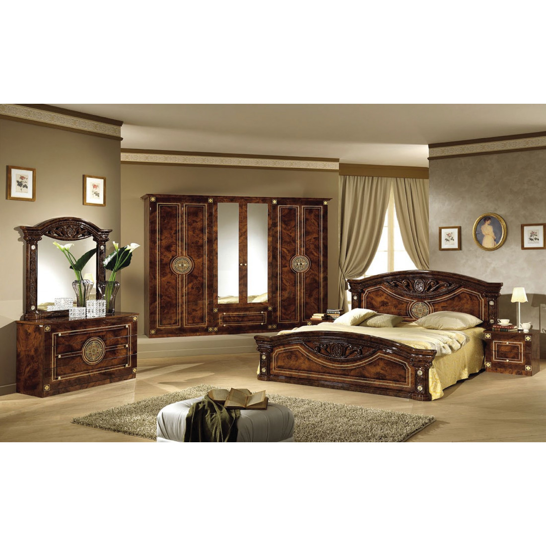 Спальня Рома (орех) композиция 2 от Российской фабрики «ДИА мебель» выполнена в строгом, классическом стиле. Ореховый цвет в сочетании с глянцевым покрытием придает элегантность. Такая спальня поможет Вам окунуться в атмосферу роскоши и комфорта. Большой шестистворчатый шкаф поможет с пользой заполнить место. Безшумные и плавно закрывающиеся дверцы шкафа и комода помогут с легкостью забыть о шуме по утрам. Вся коллекция "Рома" предназначена только для истинных ценителей элегантного классического стиля.