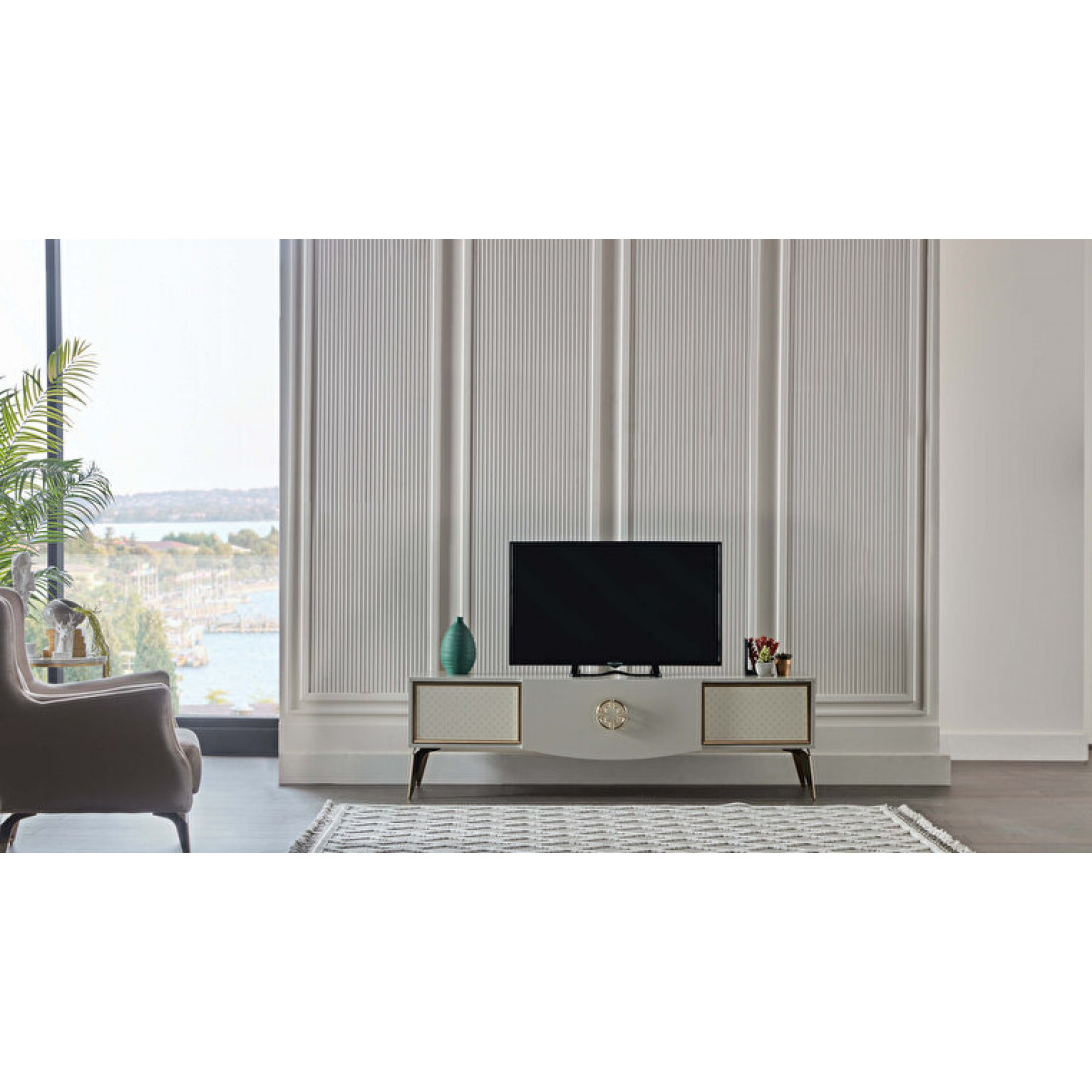 Тумба под ТВ Валеско с рисунком в стиле АРТ-ДЕКО, золотисто-желтыми фитилями, металлическими ручками,ножками