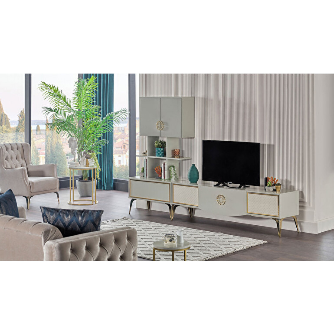 Тумба под ТВ Валеско с рисунком в стиле АРТ-ДЕКО, золотисто-желтыми фитилями, металлическими ручками,ножками
